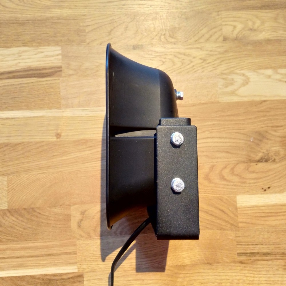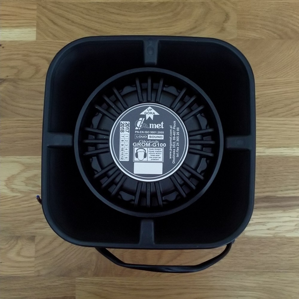 Głośnik płaski o mocy 100W przeznaczony do montażu kamuflowanego w pojazdach uprzywilejowanych. Zalecany montaż w komorze silnika za kratką grilla, bez kontaktu z elementami chłodnicy. Ukierunkowanie wylotu tuby ku przodowi pojazdu jest warunkiem uzyskania właściwego poziomu dźwięku, który uzależniony jest również od stopnia przesłonięcia wylotu głośnika.